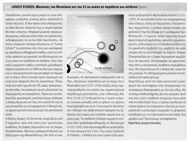 Lovely Echoes features an innovative and engaging mixture of medieval and 21st century music. It features the voices of mezzo soprano Efi Minakouli and bass Tobias Schlierf, with new original music composed by Spiza members Sofia Kamayianni and Dora Panagopoulou.