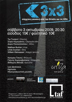 The 3x3 project was an ambitions undertaking that occupied Spiza throughout 2009, culminating in a sell-out concert in October of that year. It involved composers and performers from both Greece and the USA, who worked closely together towards the creation and performance of new musical works.